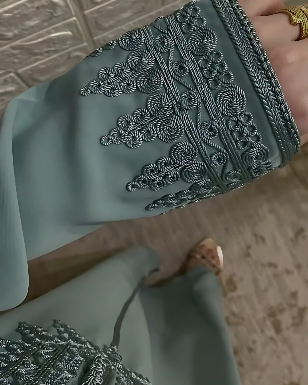 Couleur : Vert amande pâleTissu : CrêpeTravail : Randa 100% faite à la mainCoupe : Mekhzania...