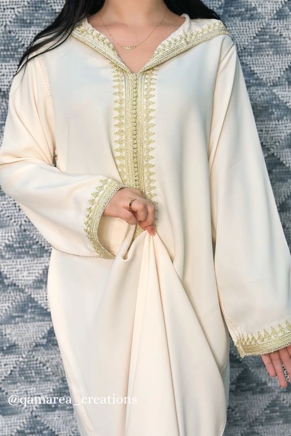 Couleur : Sable doréTissu : Kamkha à motifs discretsTravail : Zwak maalem raffiné, avec Debbana au...