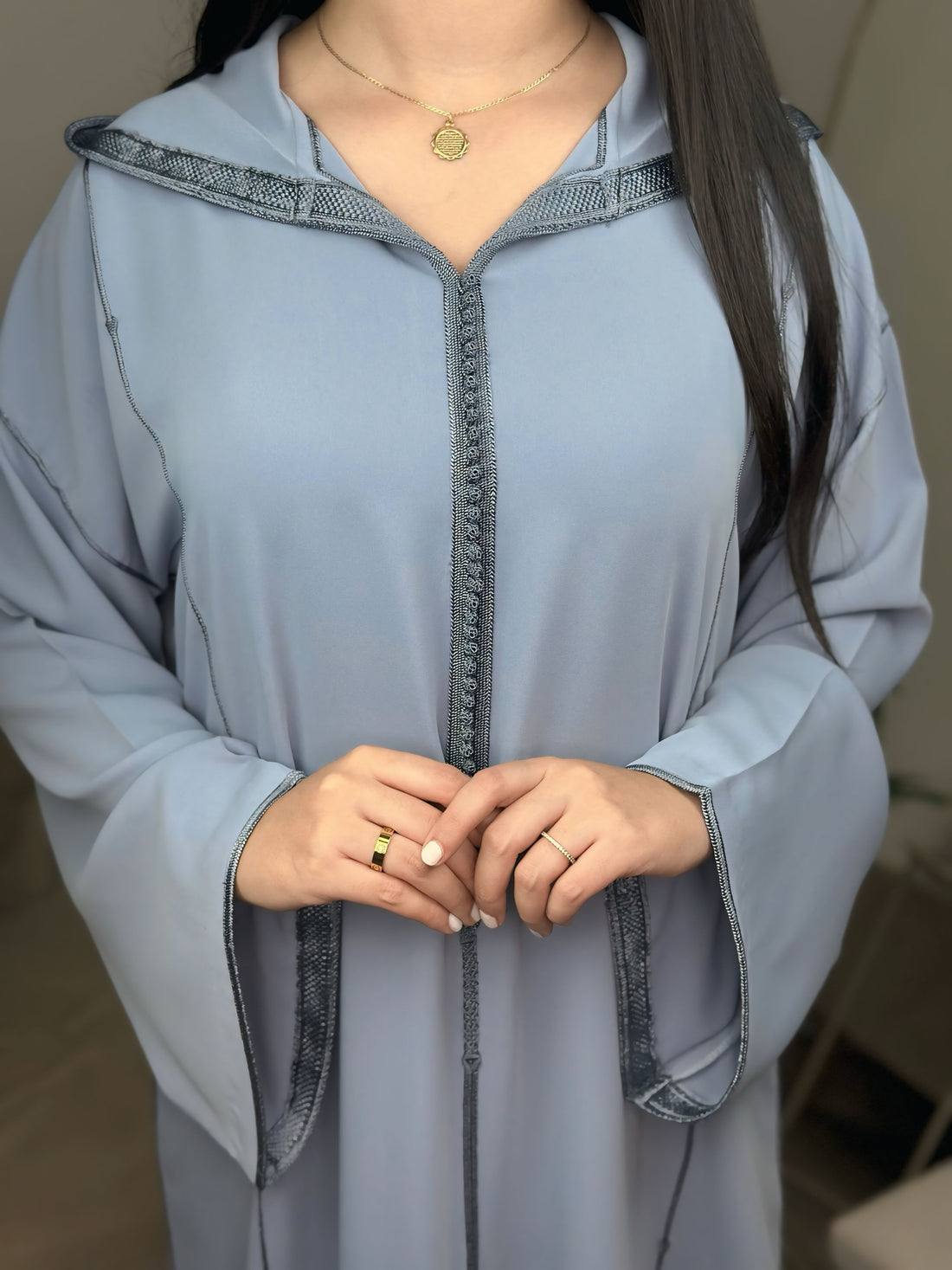 Couleur : Bleu gris doux Jellaba en tissu crêpe, travaillée façon Berchmane avec Sfifa Mrema au niveau des manches...