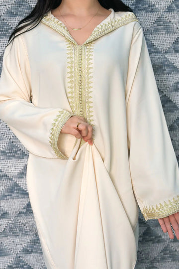 Couleur : Beige champagne aux reflets nacrés Cette djellaba une pièce, confectionnée dans une Kamkha...