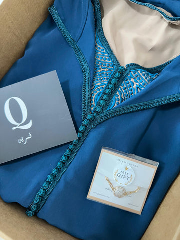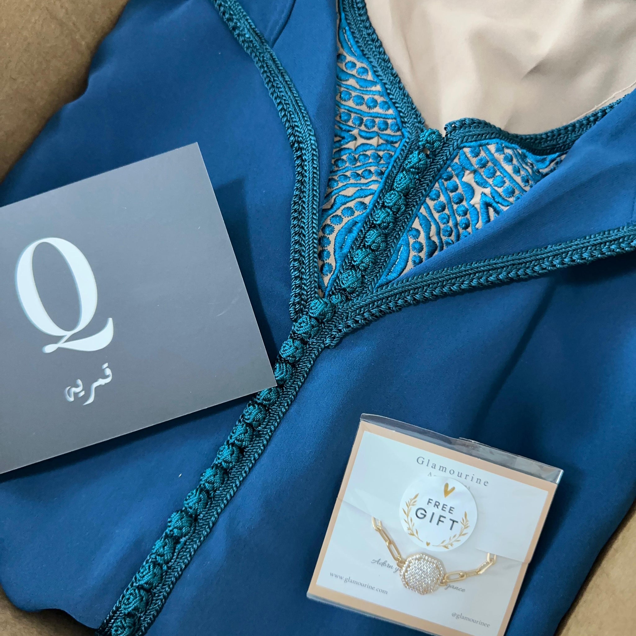 Couleurs : Sous-pièce : Bleu roi en crêpe léger Djellaba extérieure : Écru cassé avec...