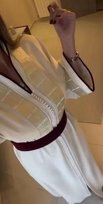 Nos artisans brodent à la main chaque détail avec une précision remarquable, perpétuant l’héritage marocain dans le respect des traditions.