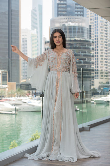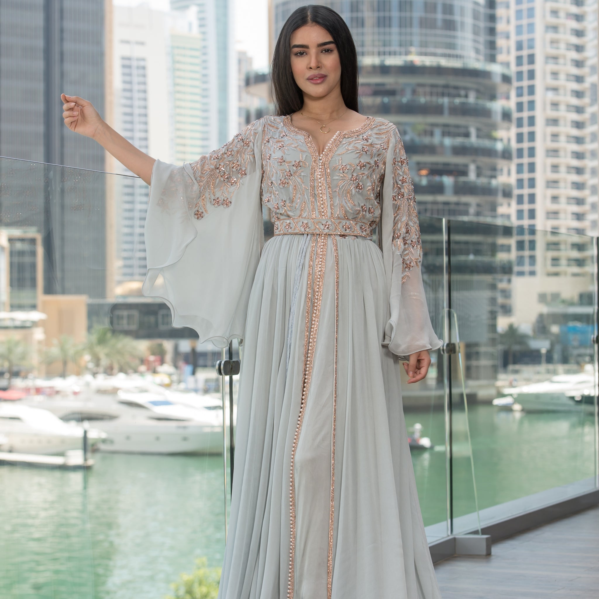 Caftan "Lina" – Gris Perle & Broderies Grenat Un caftan qui incarne la puissance du...