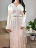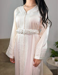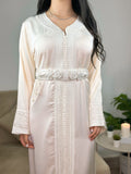 Un caftan en drap de soie blanc cassé, travaillé avec une sfifa et des broderies ton sur ton qui lui confèrent une élégance intemporelle. La ceinture assortie souligne délicatement la taille et ajoute une touche raffinée. Fluide et lumineux, ce modèle est idéal pour des occasions spéciales où sobriété et raffinement se rencontrent.