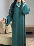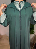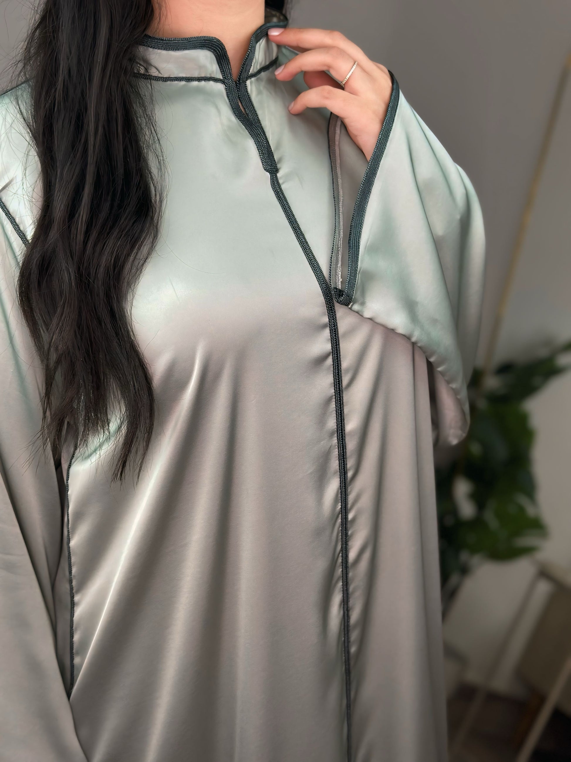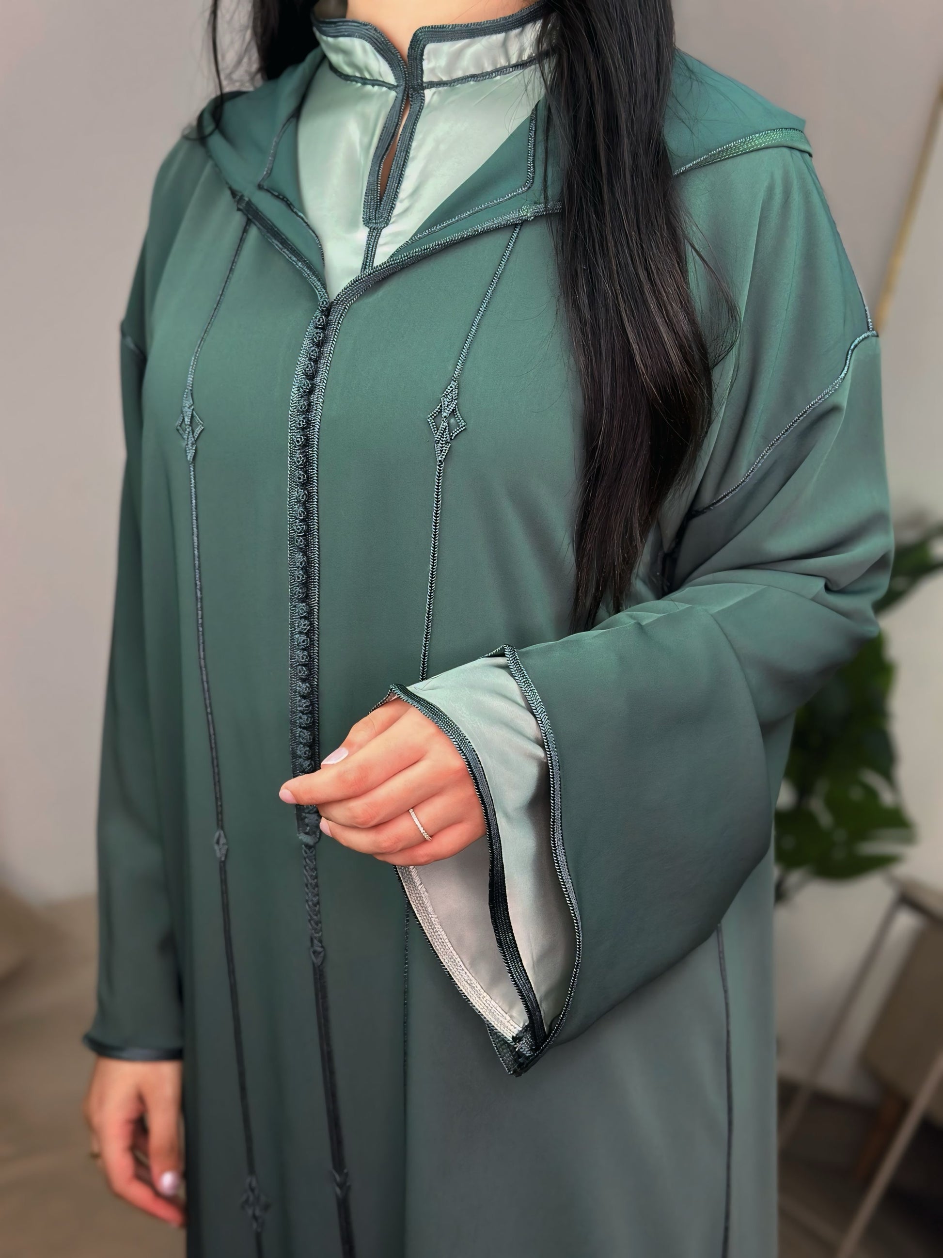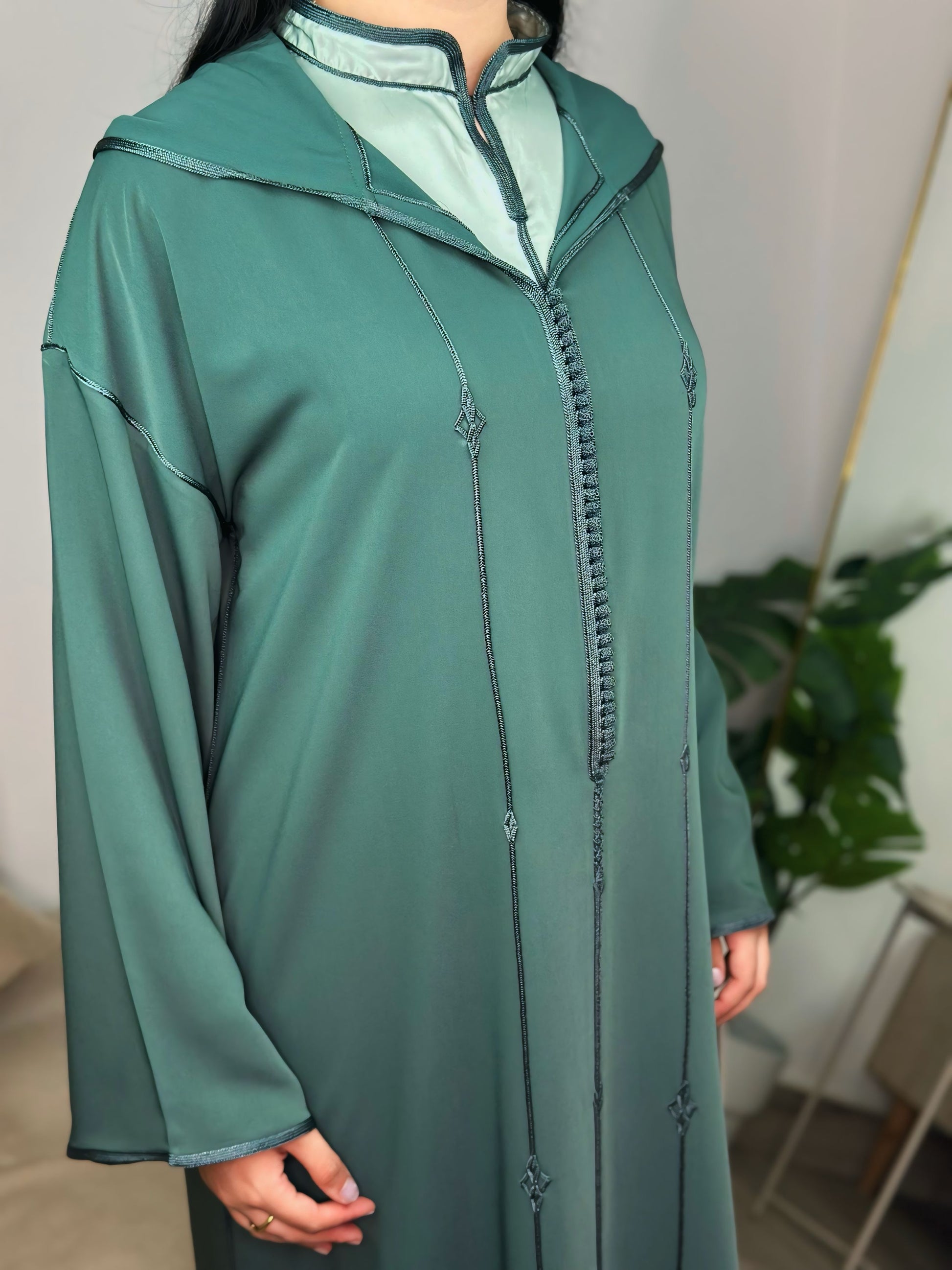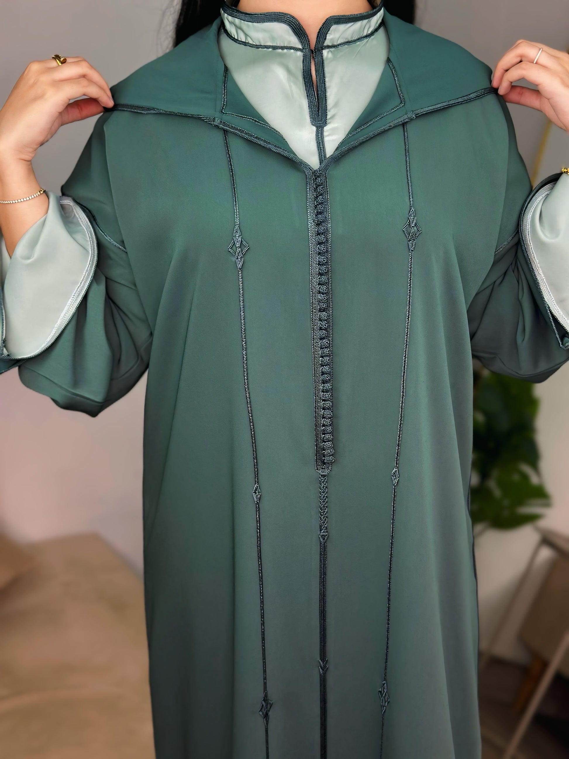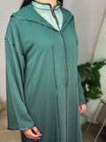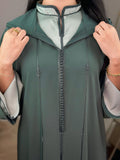 Une jellaba deux pièces qui allie modernité et authenticité. La surpièce en crêpe vert profond se superpose harmonieusement à une sous-pièce en satin lumineux au col officier raffiné. Le travail en Berchman ton sur ton apporte une touche d’élégance discrète, tandis que la coupe mekhzania traditionnelle assure confort et fluidité. Un modèle intemporel, pensé pour sublimer vos moments du quotidien comme vos occasions spéciales.