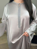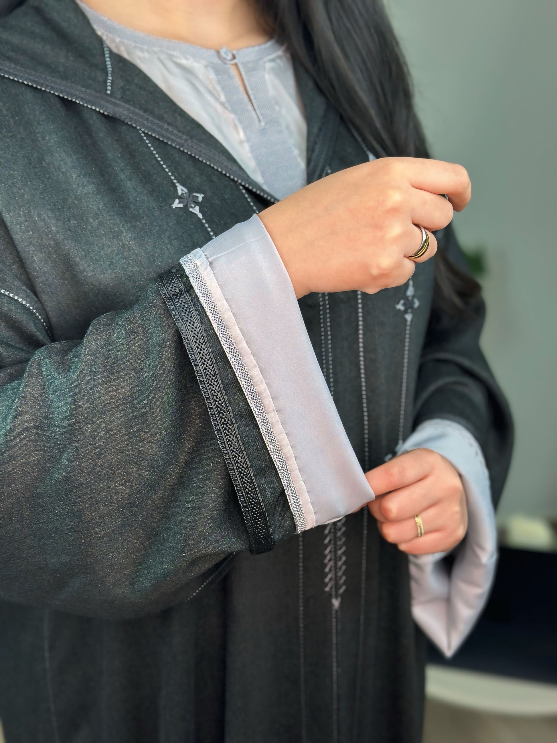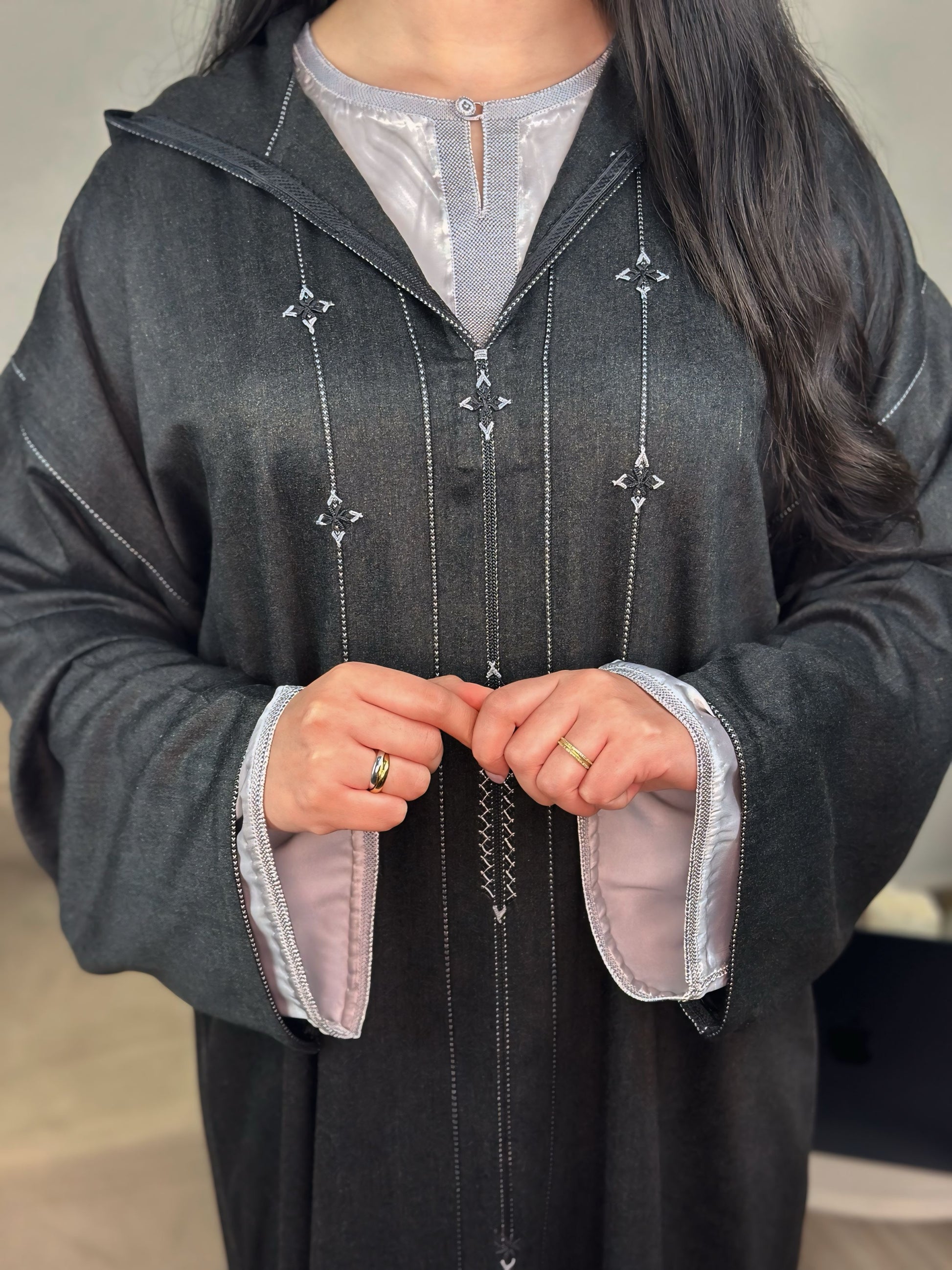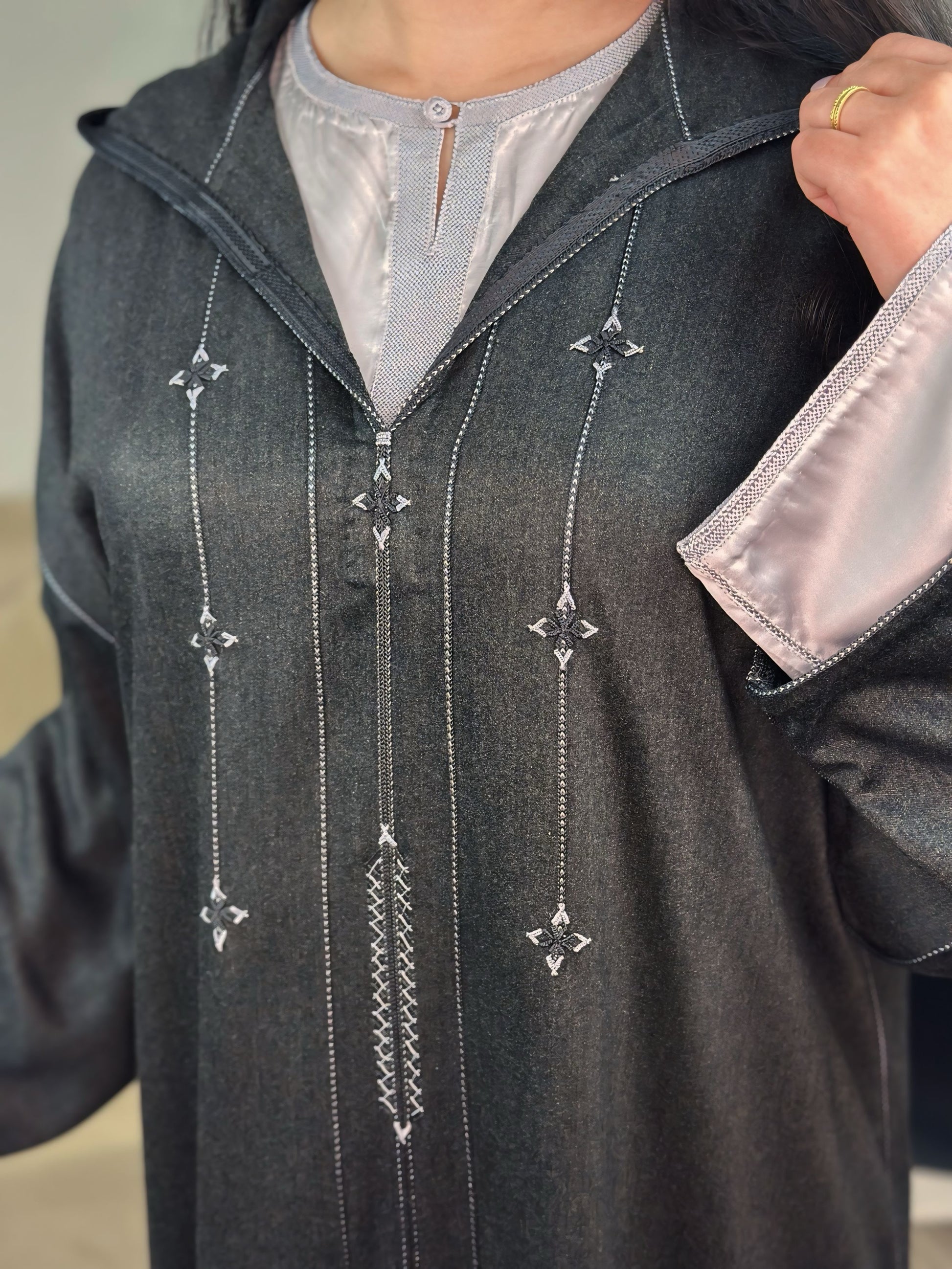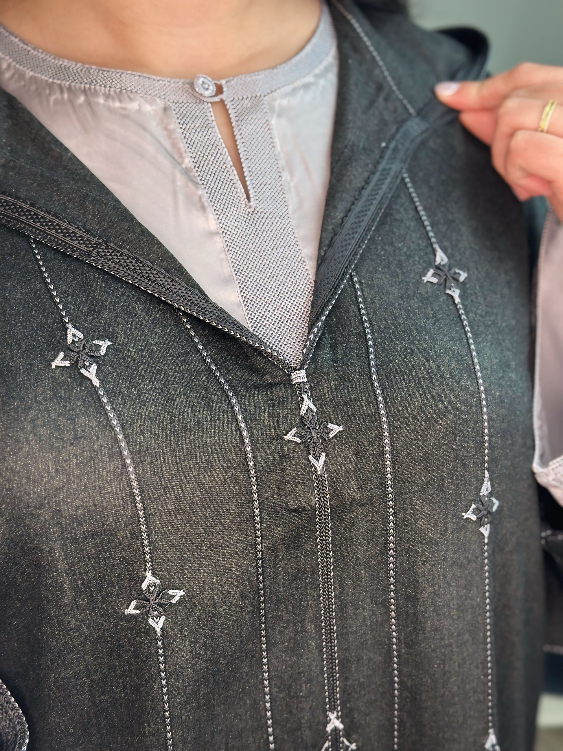 Élégante et intemporelle, cette jellaba deux pièces associe la noblesse du tissu mlifa couleur gris charbon à la douceur d’un kmiss en satin gris perle.