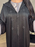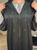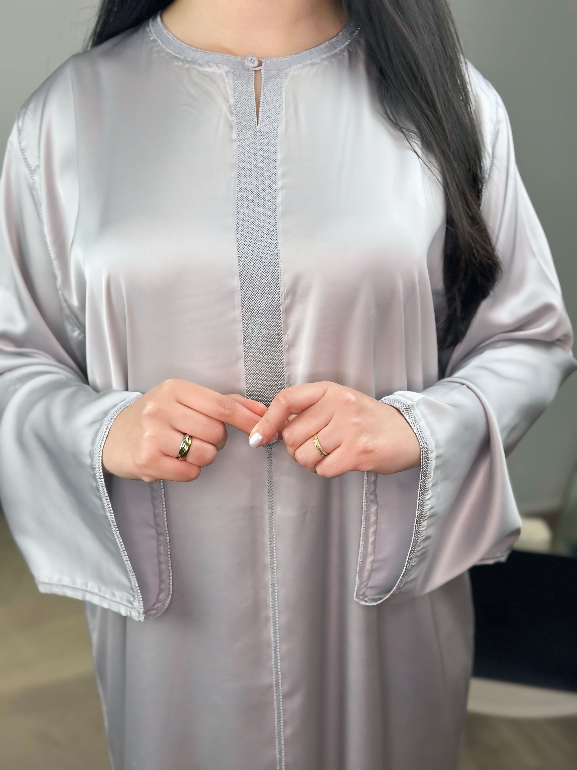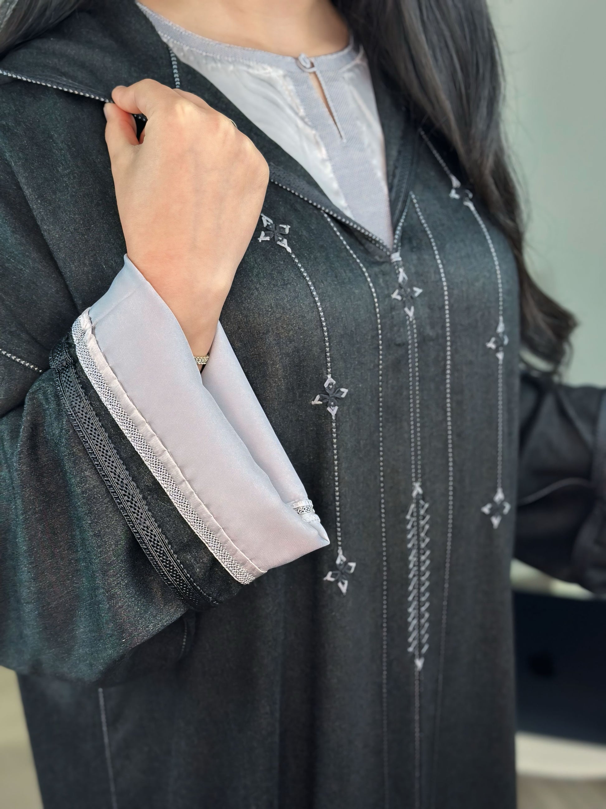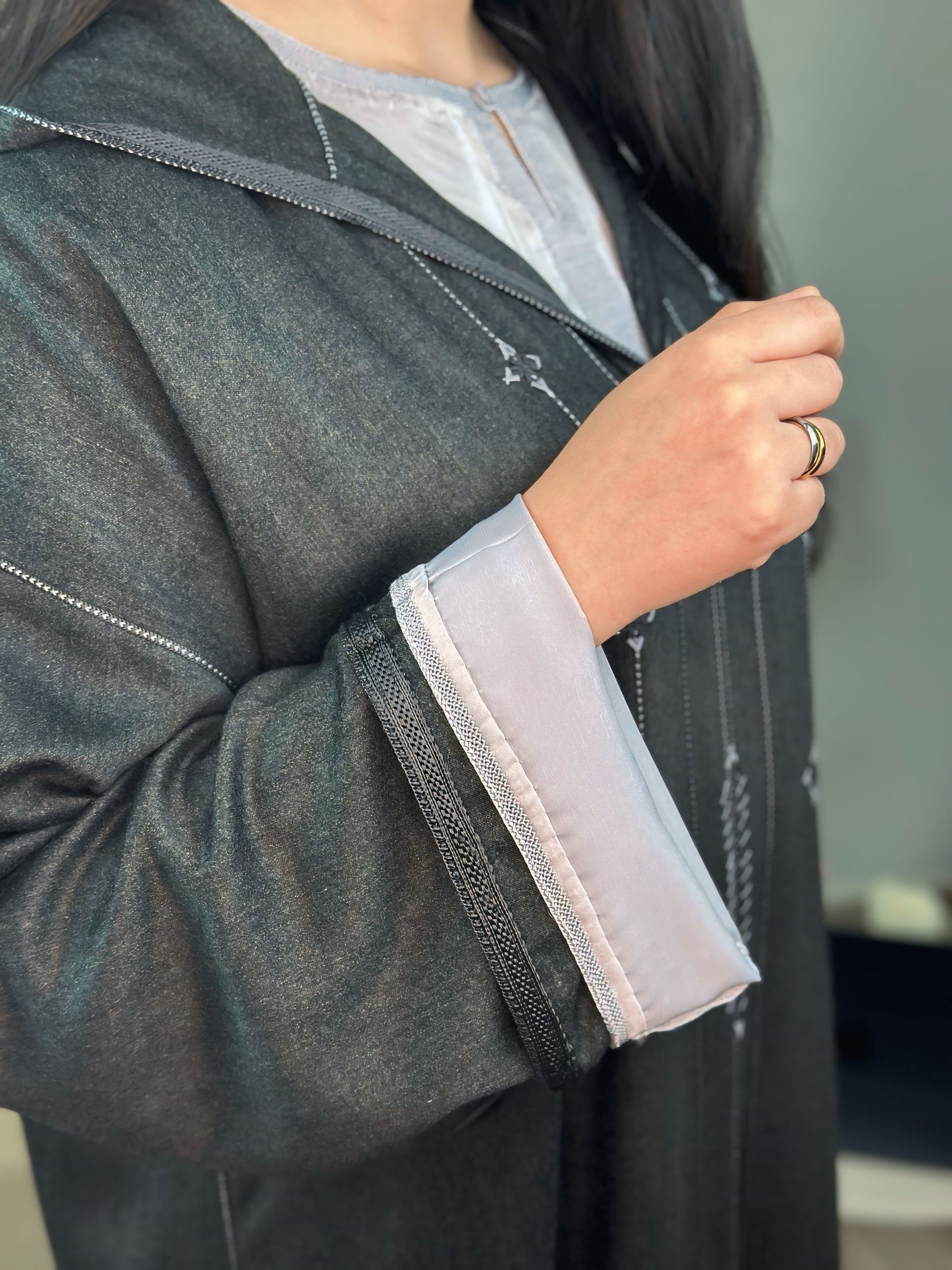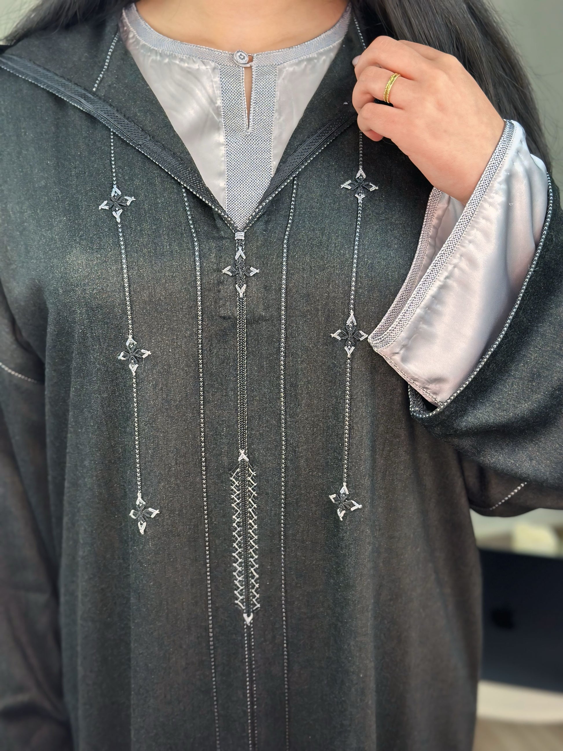 Élégante et intemporelle, cette jellaba deux pièces associe la noblesse du tissu mlifa couleur gris charbon à la douceur d’un kmiss en satin gris perle.