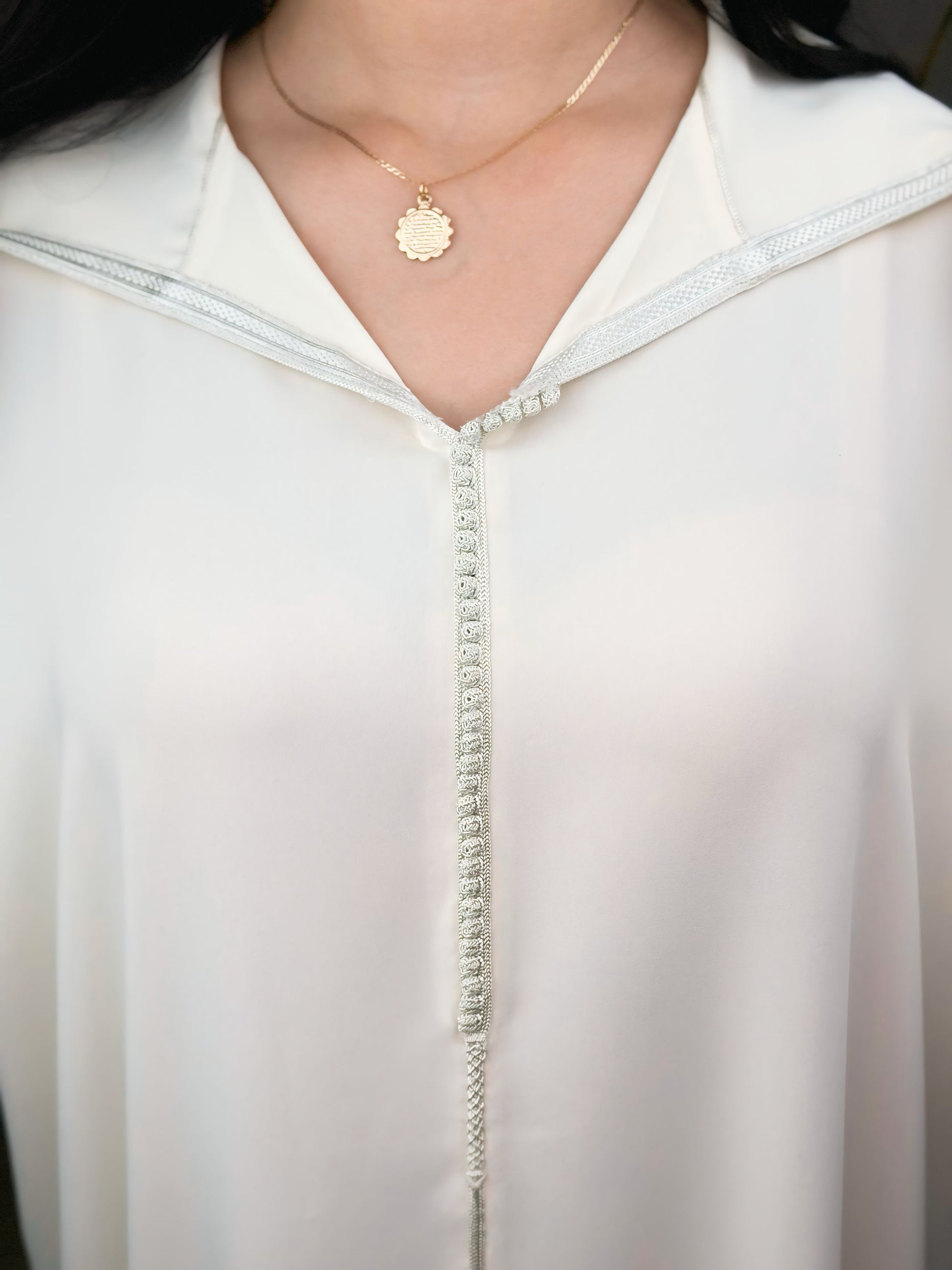 Élégante et intemporelle, la Jellaba Mayssa se distingue par sa coupe Mekhzaniya fluide et raffinée. Confectionnée en tissu crêpe de haute qualité, elle est entièrement travaillée à la main façon Berchmane, sublimée par une Sfifa Mrema délicate au niveau des manches et de la capuche.
