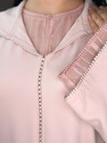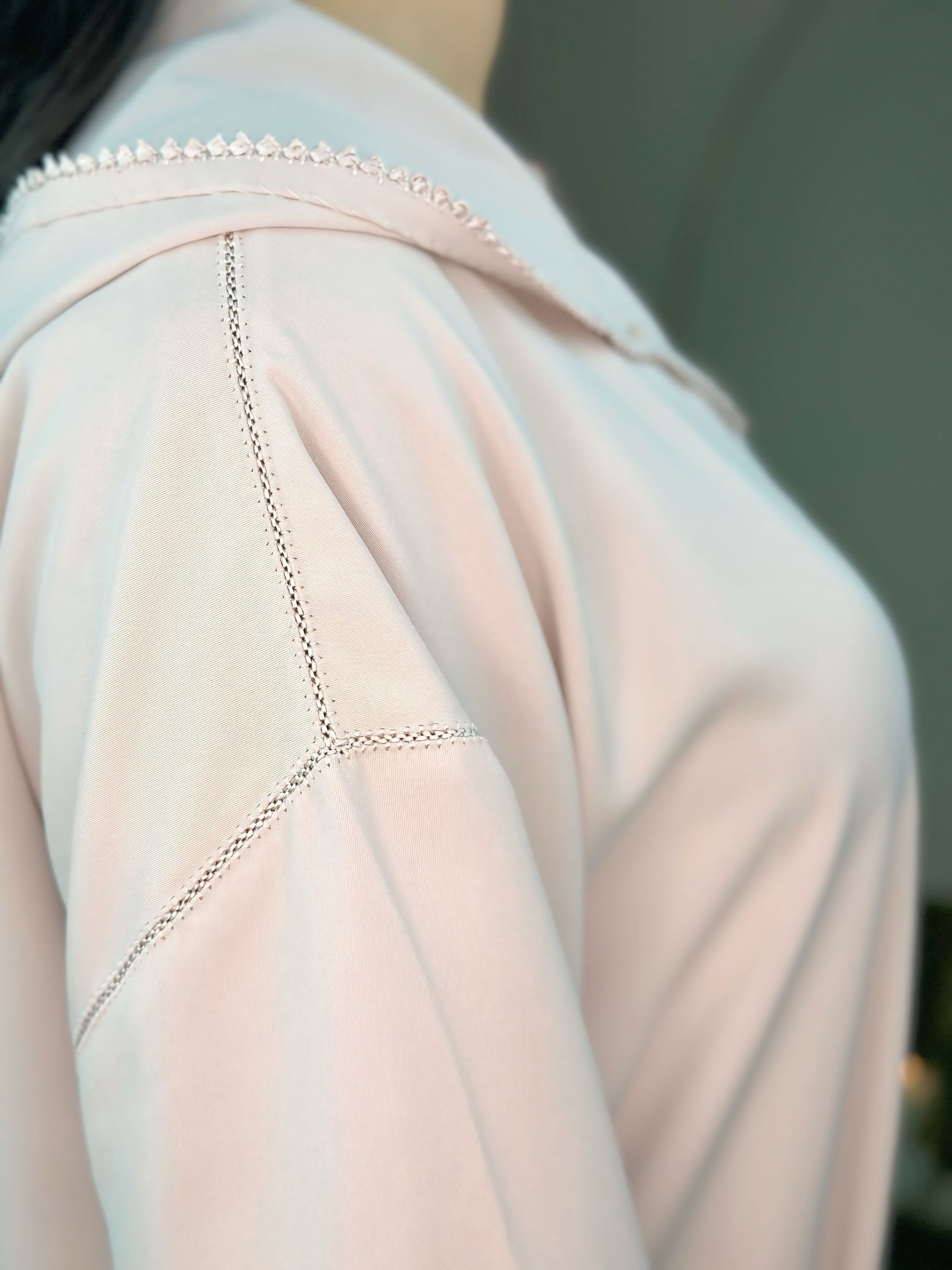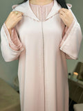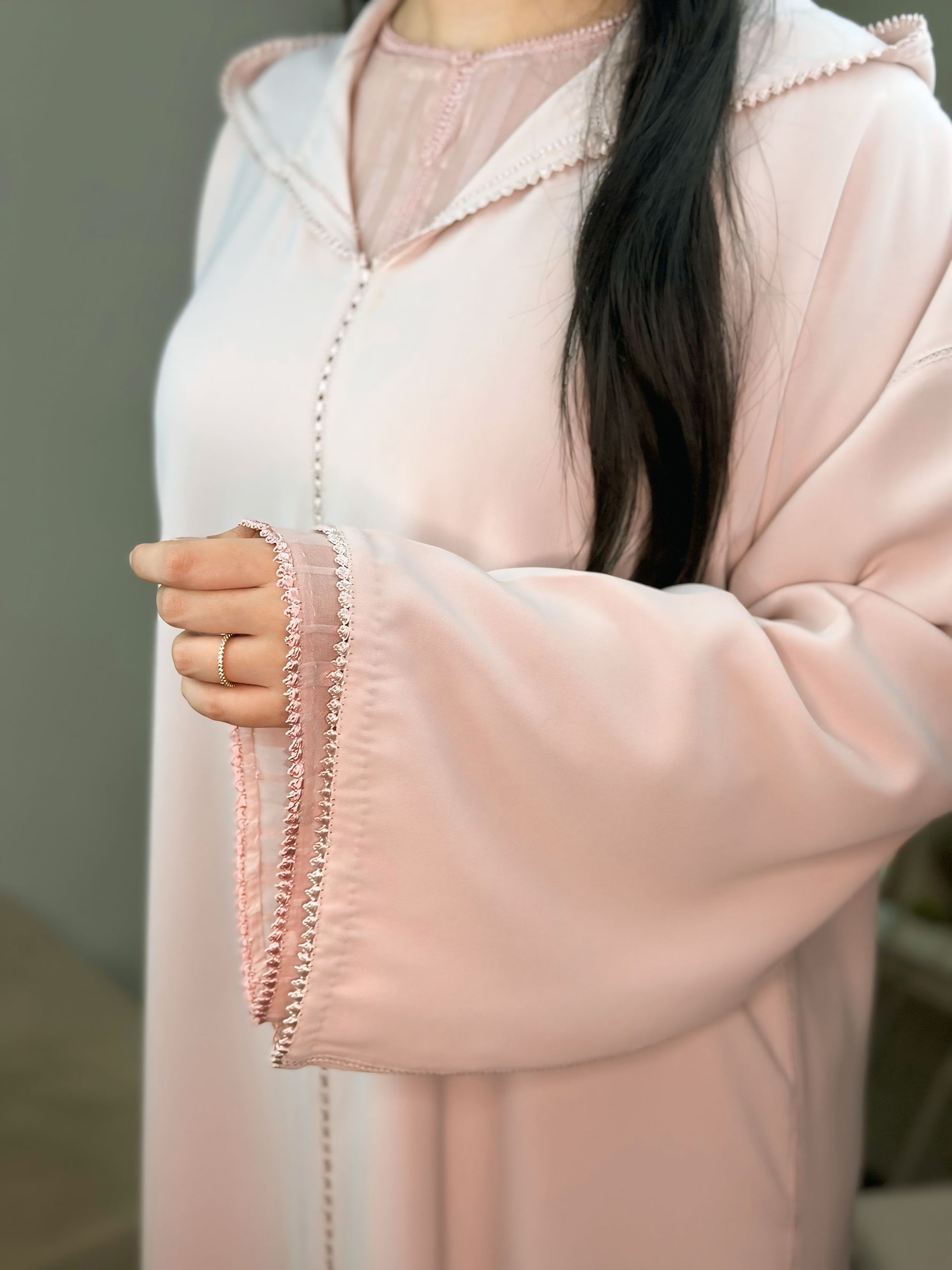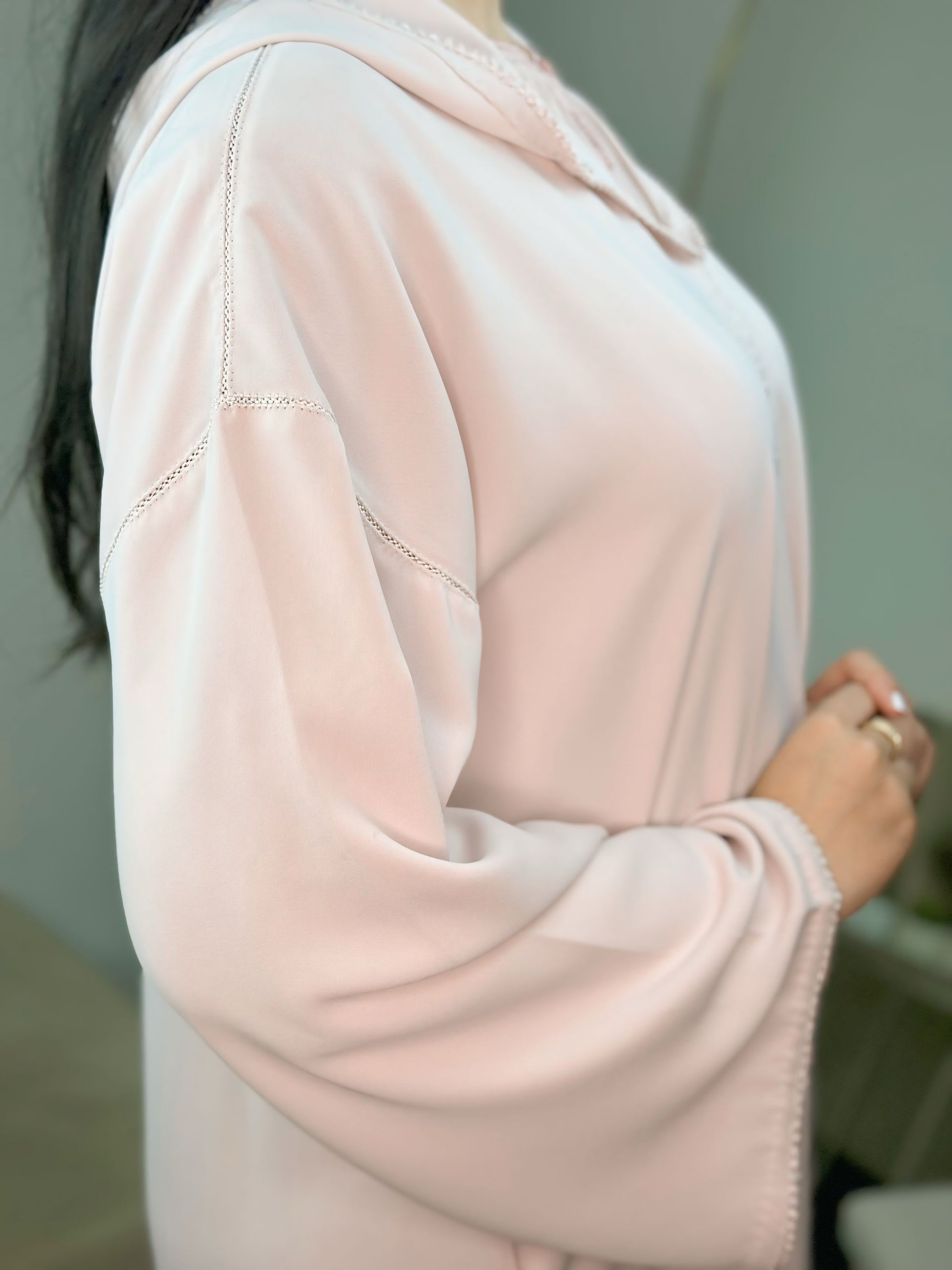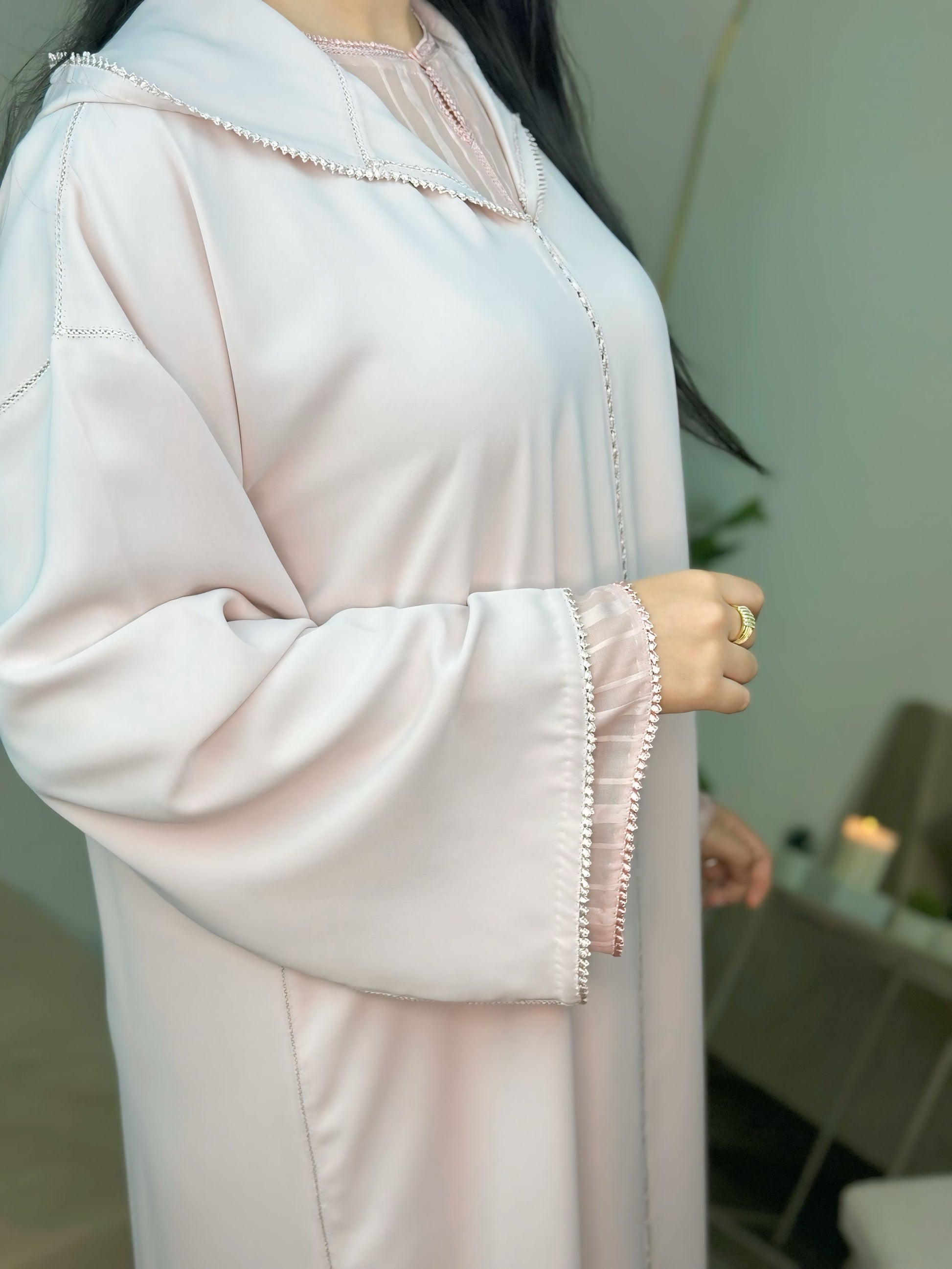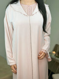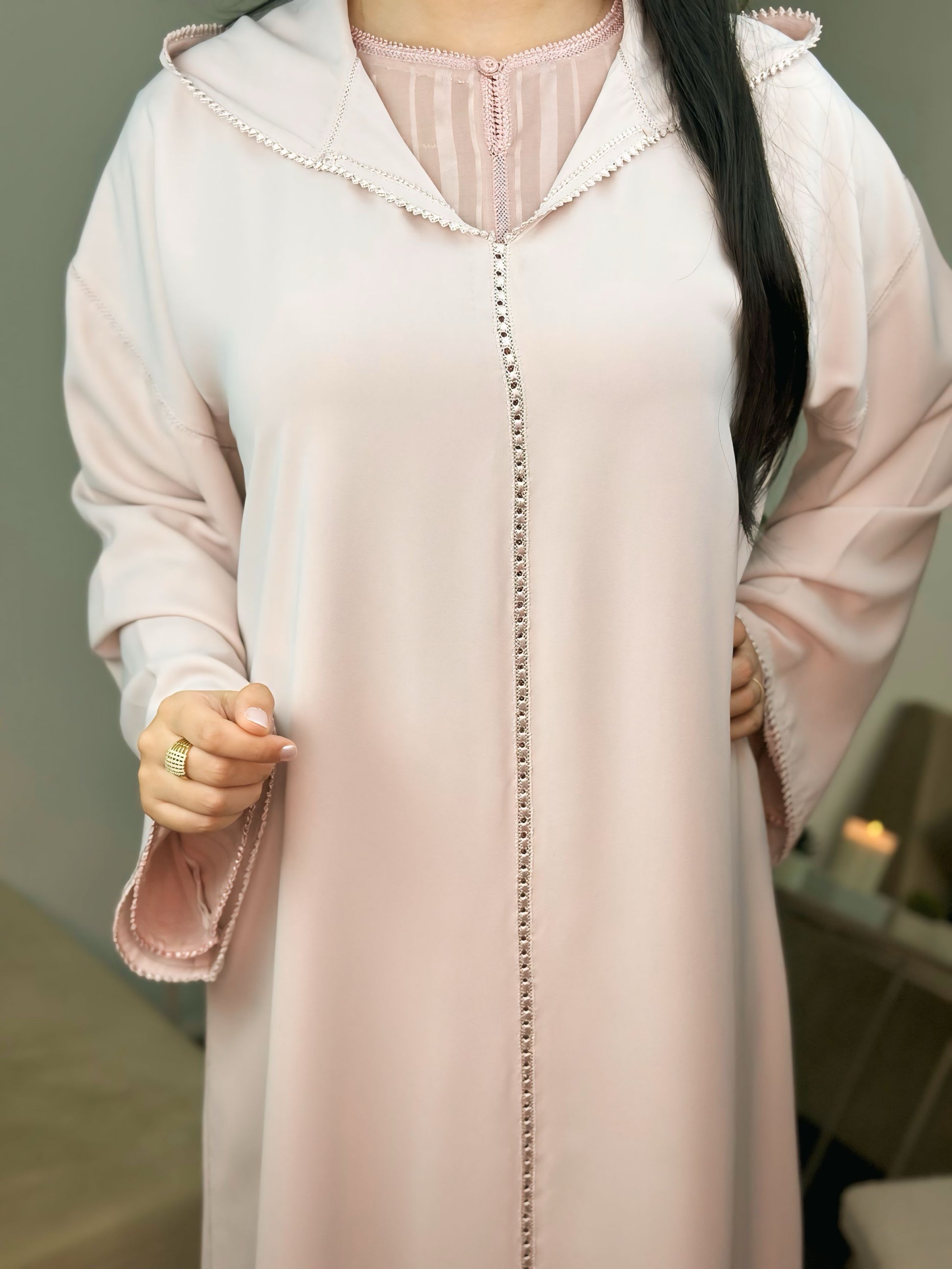 Élégante et douce, la jellaba Nahla incarne la finesse des détails faits main dans une teinte rose nude apaisante et intemporelle.
