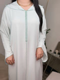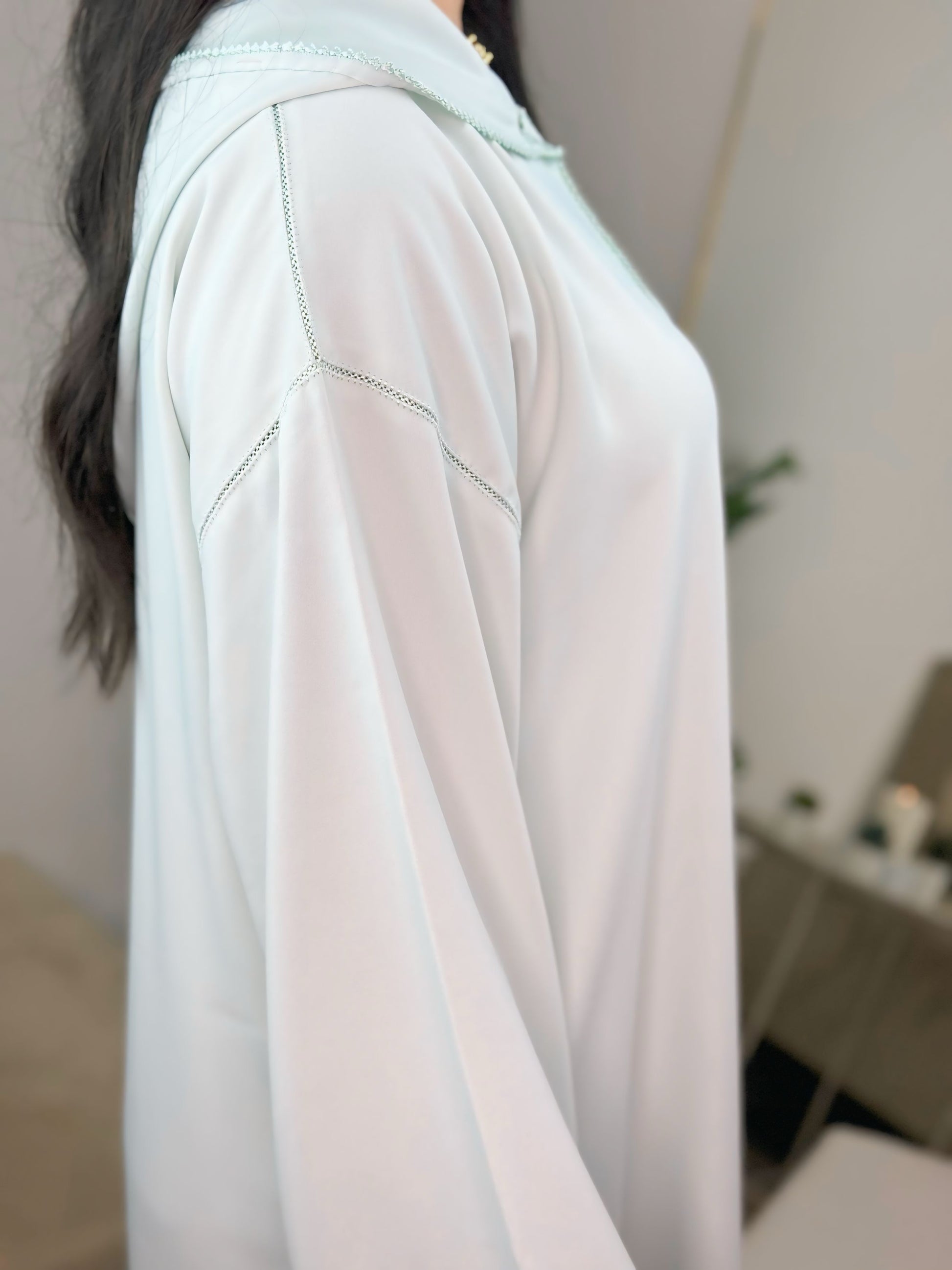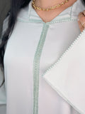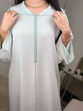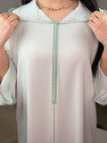 Douce et délicate, la jellaba Ranya est une ode à la féminité en toute simplicité. Sa teinte vert amande apporte fraîcheur et sérénité, parfaite pour les journées lumineuses comme pour les occasions raffinées.