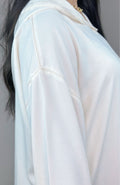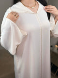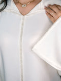 Minimaliste, élégante et intemporelle, la jellaba Zîna incarne toute la douceur de la lumière lunaire. Confectionnée dans un crêpe jacquard de qualité, elle offre une fluidité raffinée et un tombé parfait.