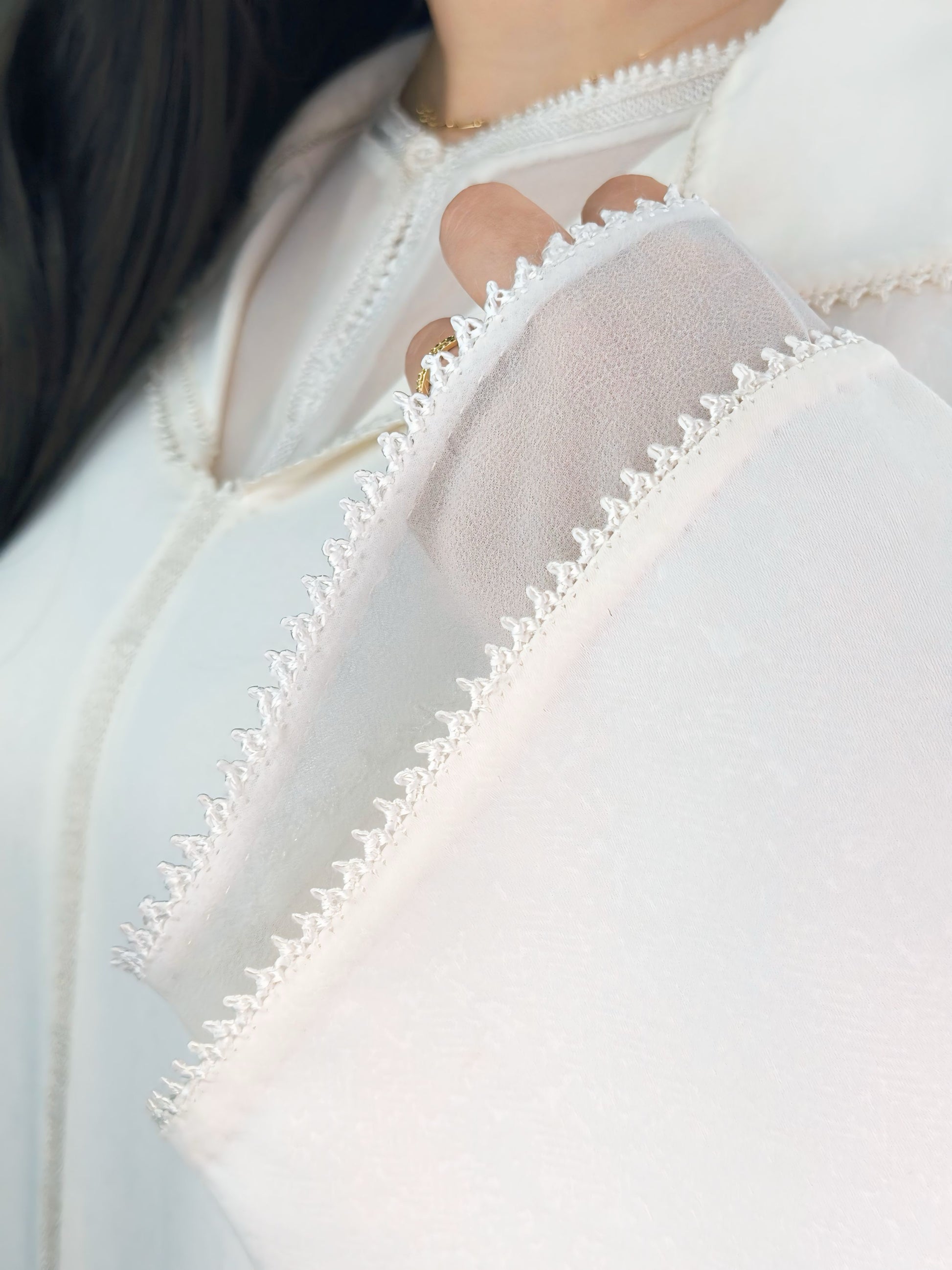 Son travail en randa hssira, minutieusement réalisé à la main, sublime la découpe mekhzania classique avec une touche de modernité. Une pièce d’exception, pensée pour une femme lumineuse, douce et affirmée.