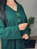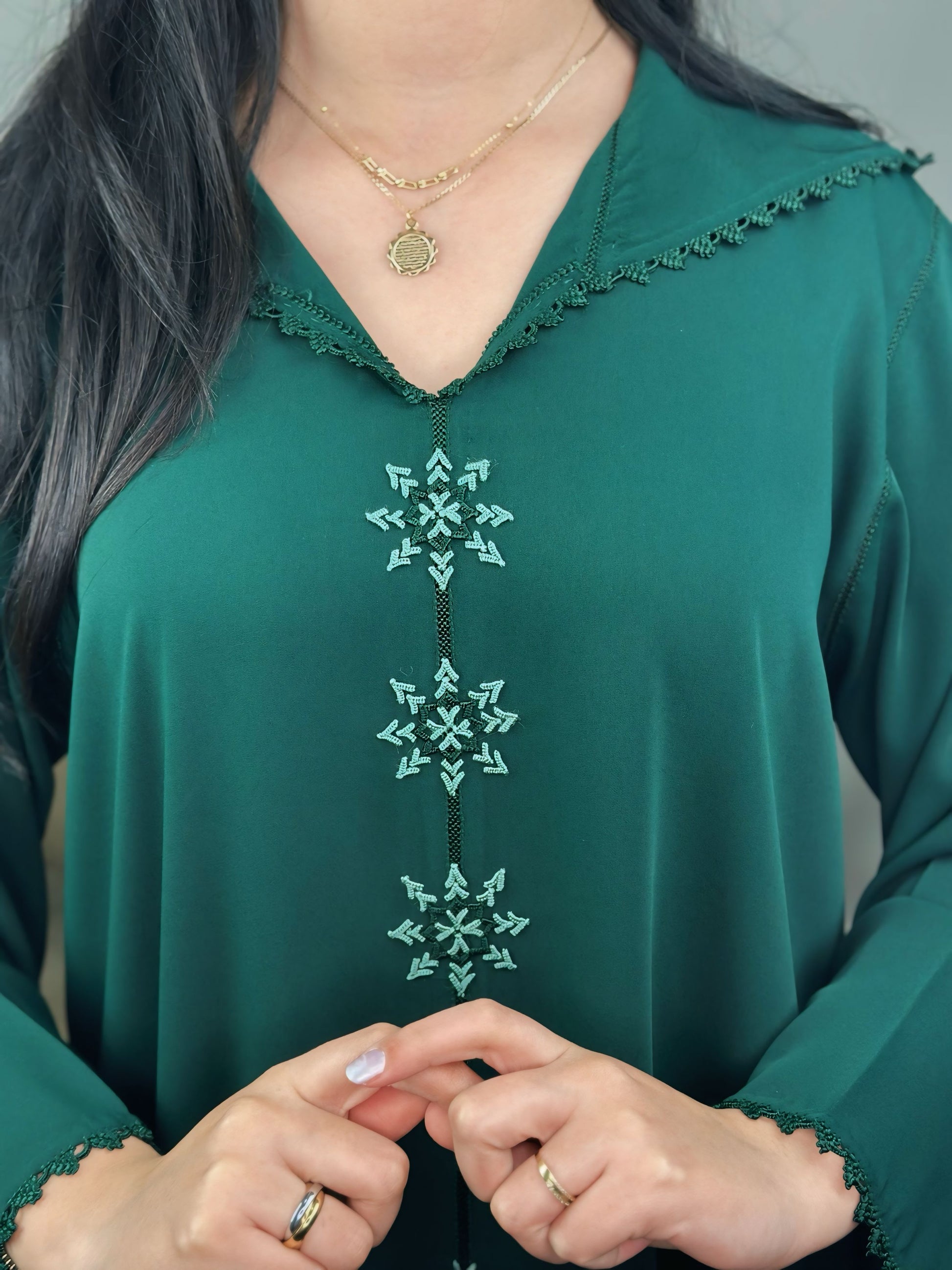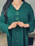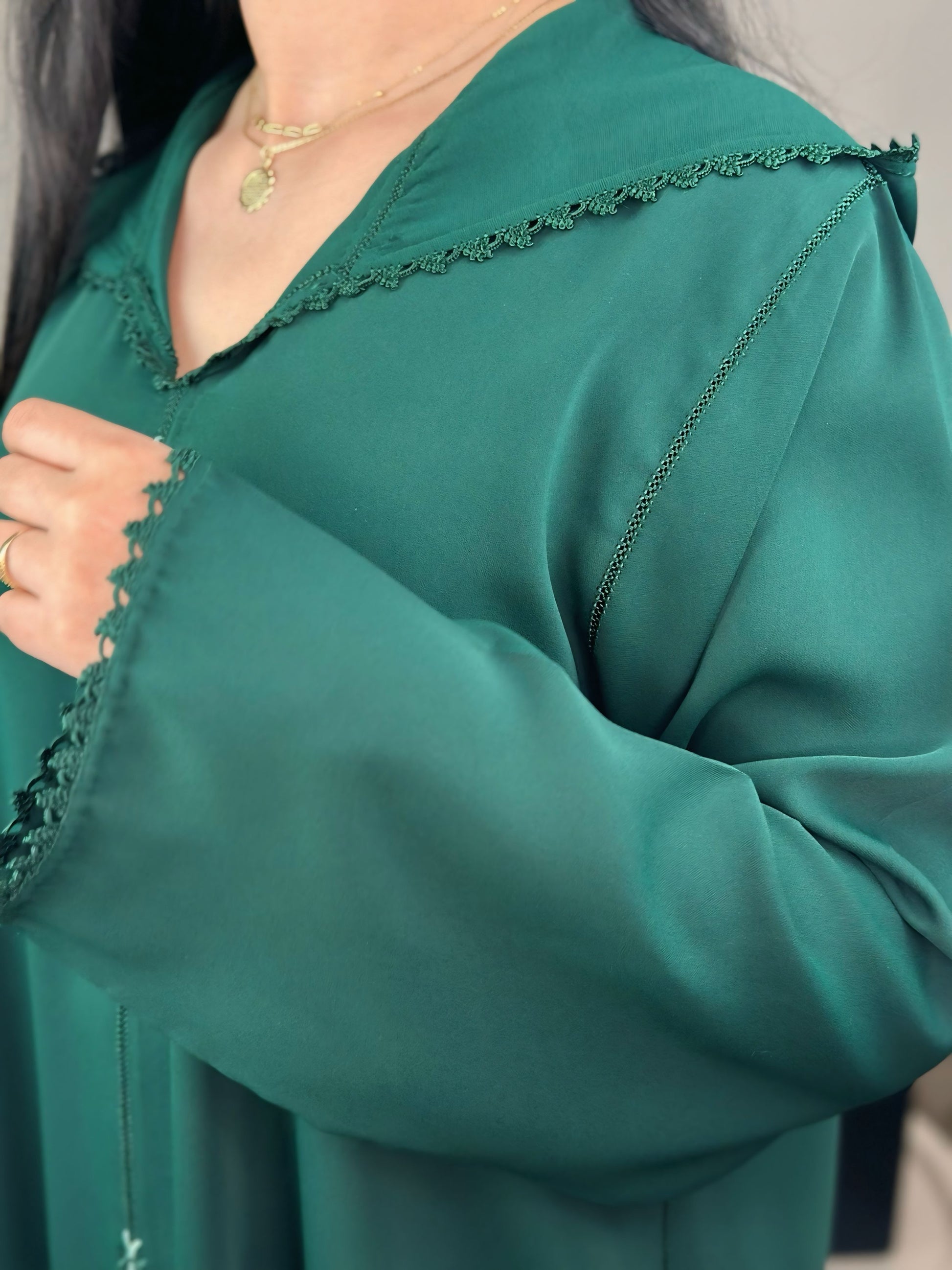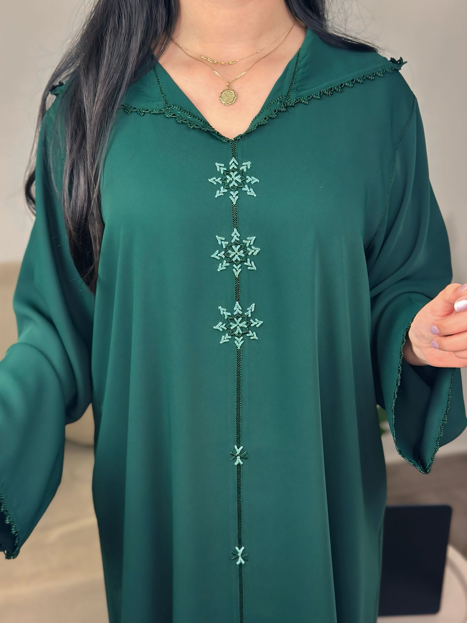 Une jellaba au charme discret, où la profondeur du vert rencontre la finesse d’un travail artisanal entièrement réalisé à la main.
