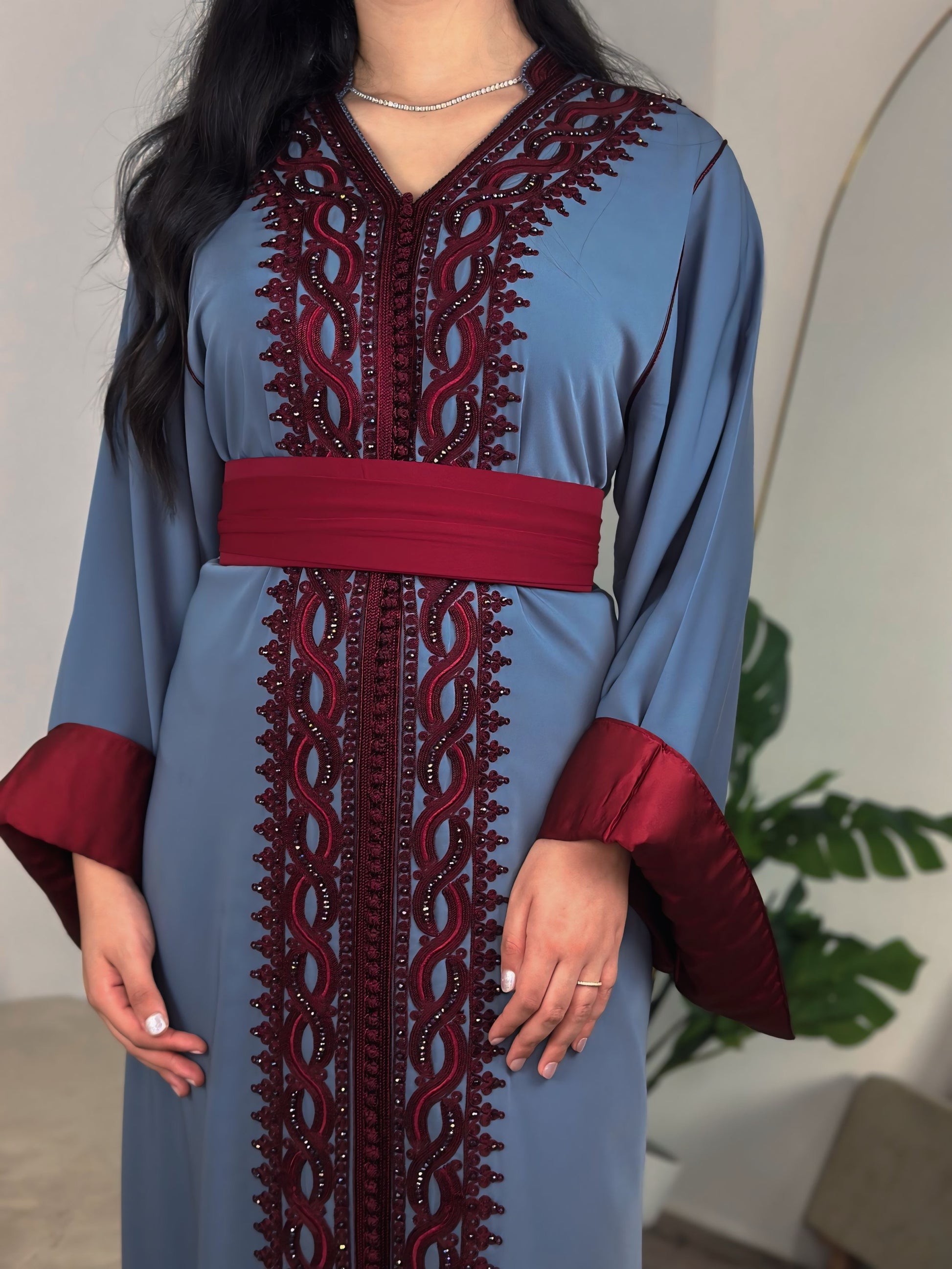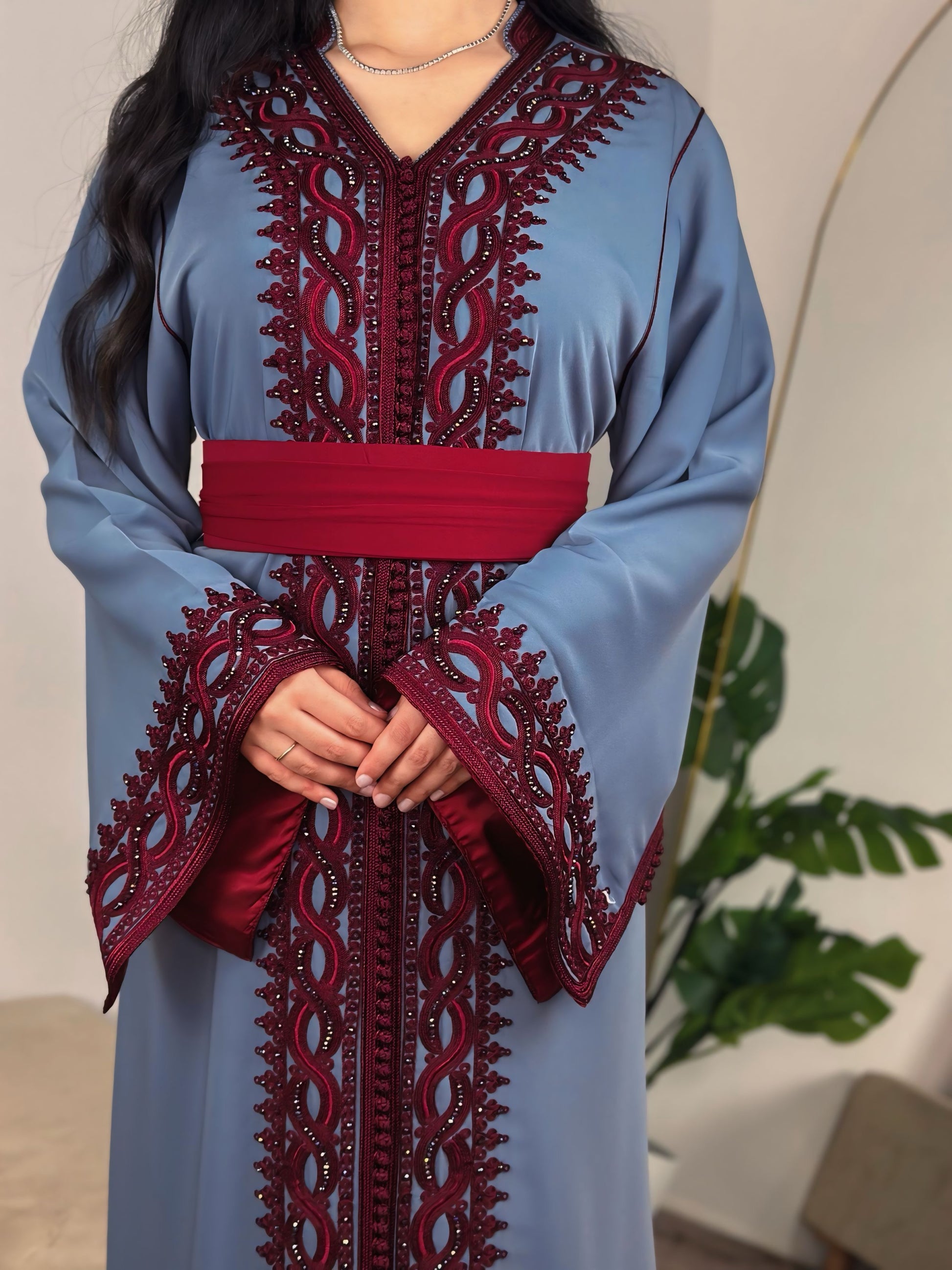 Chaque détail est pensé avec soin : sfifa grenat travaillée, tenbat traditionnelle, finitions satinées dans les manches et ceinture assortie pour une silhouette structurée et élégante.