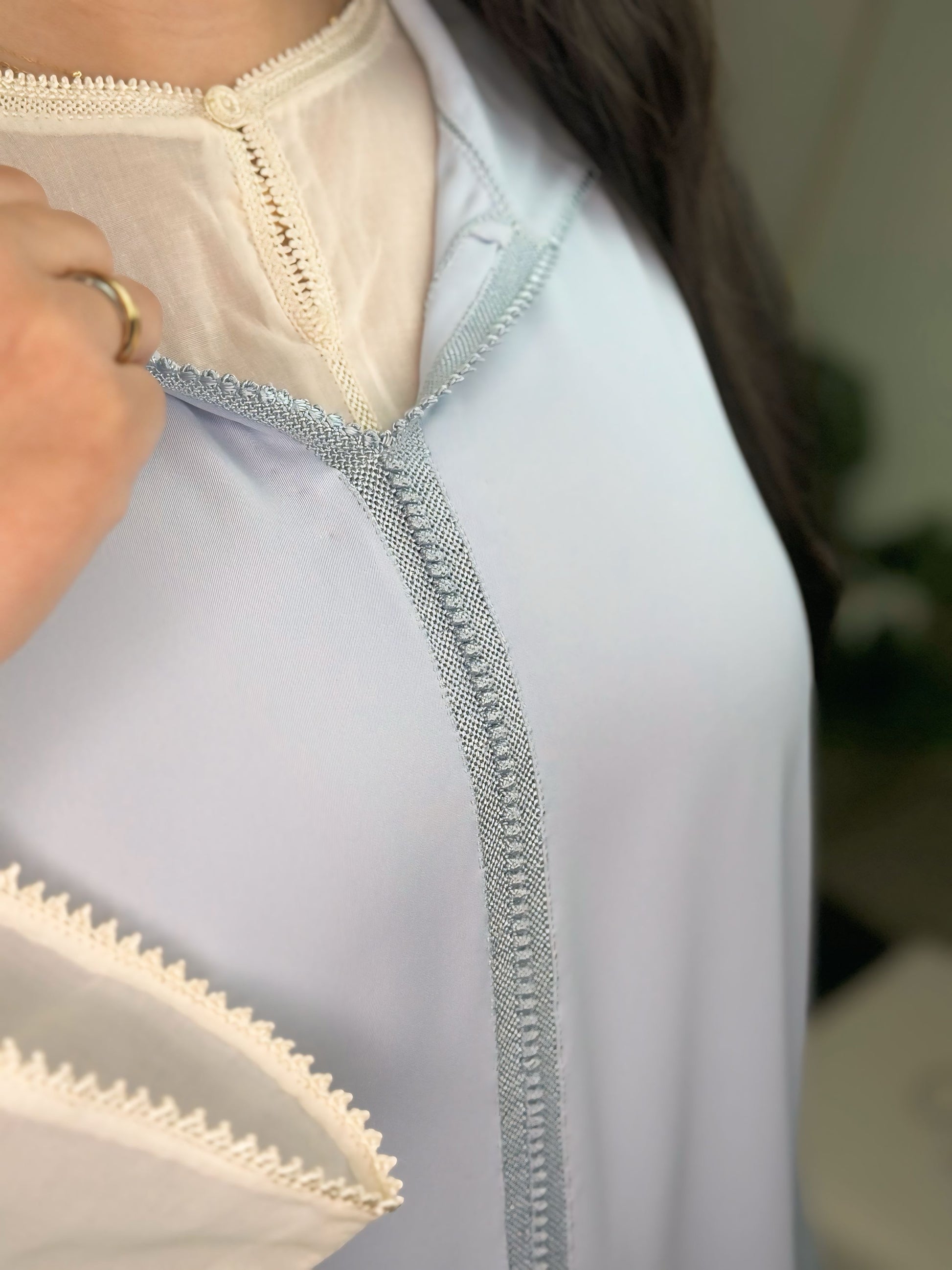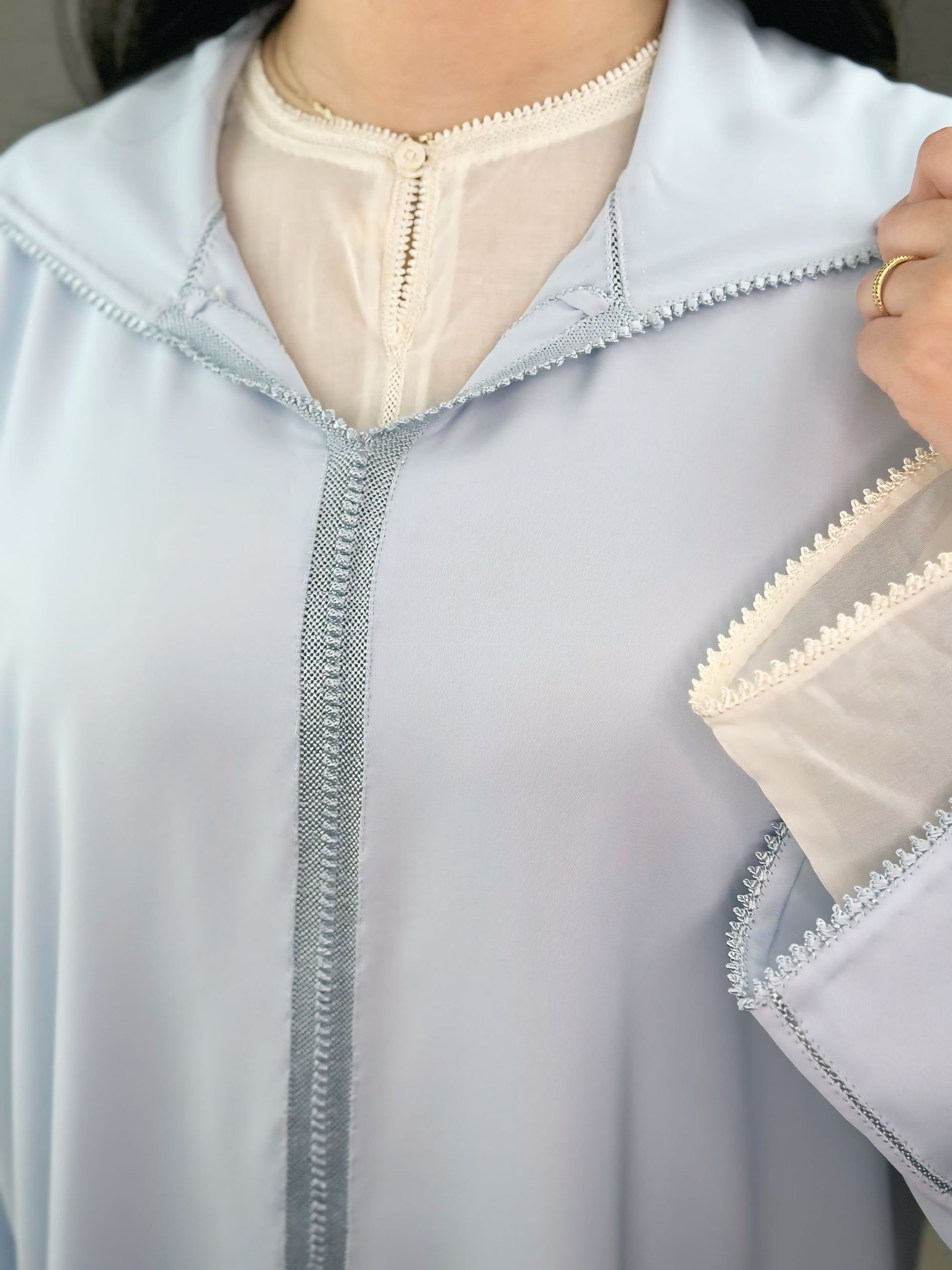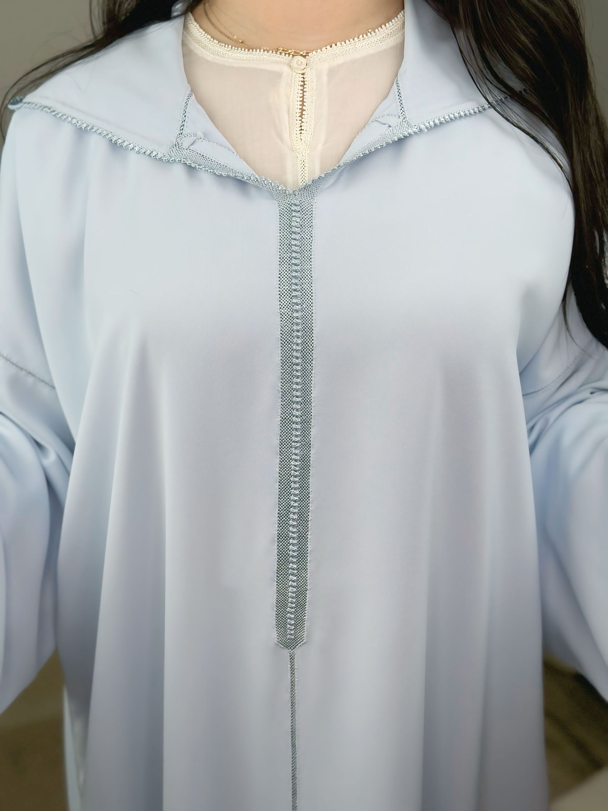 Délicate, lumineuse et intemporelle, cette jellaba deux pièces séduit par son élégance épurée et son raffinement artisanal. Confectionnée dans un crêpe fluide de qualité, elle offre un tombé léger et harmonieux qui sublime la silhouette avec grâce.